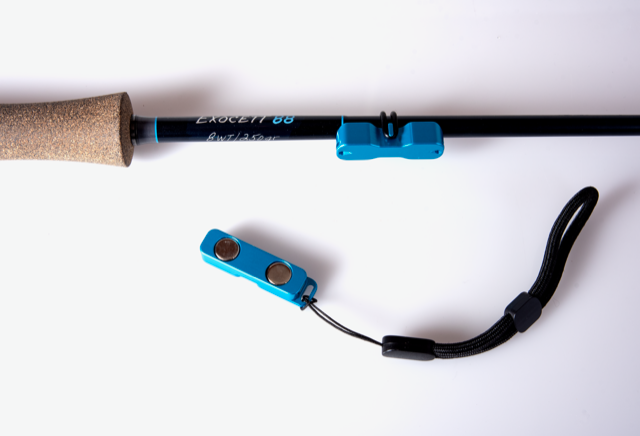 The Rod Rack is a two-part system designed to hold your fly rod securely during fly changes, fish releases, snack time, and any other situation where you might need to set your rod down for a minute. The base plate securely attaches to the butt of your rod with a strong rubber clasp, while the top magnet is easily attached to your waders, pack, or vest. Get them close, and click, your rod is secure.